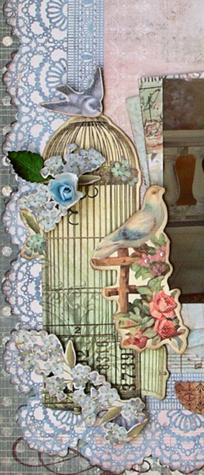 A close up of the bird cage collectable die cut, that is enhanced by some of the flowers from the sticker sheet (another thing I love). These sheets help you replicate some of your images. You can cut out what you like & either stick it straight on - or use baby powder on the reverse to remove he stick then adhere to your project using foam tape. Some more flowers, a fabric leaf, some curled florist wire (from the flowers) and your images start to come to life.