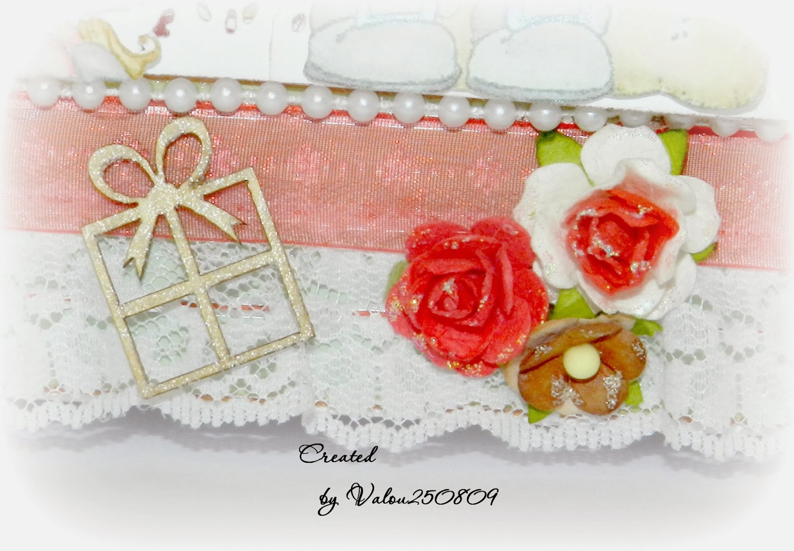 Then, I added a white and red rose (25 mm), a red rose (20 mm) and white and brown Lilidaft. They three are all covered with "Glitter Stickels Frosted Lace".